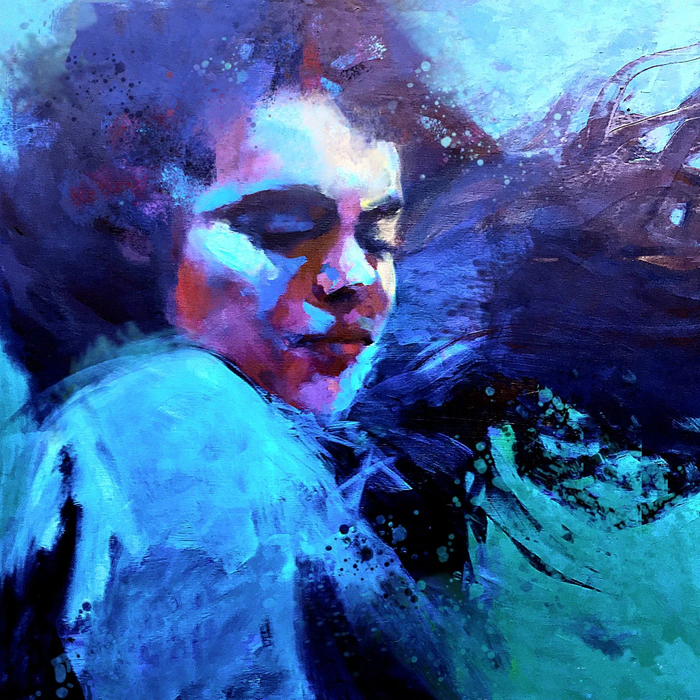 Expressionist figurative oils on linen and wood, with texture, vibrant colors, and movement.